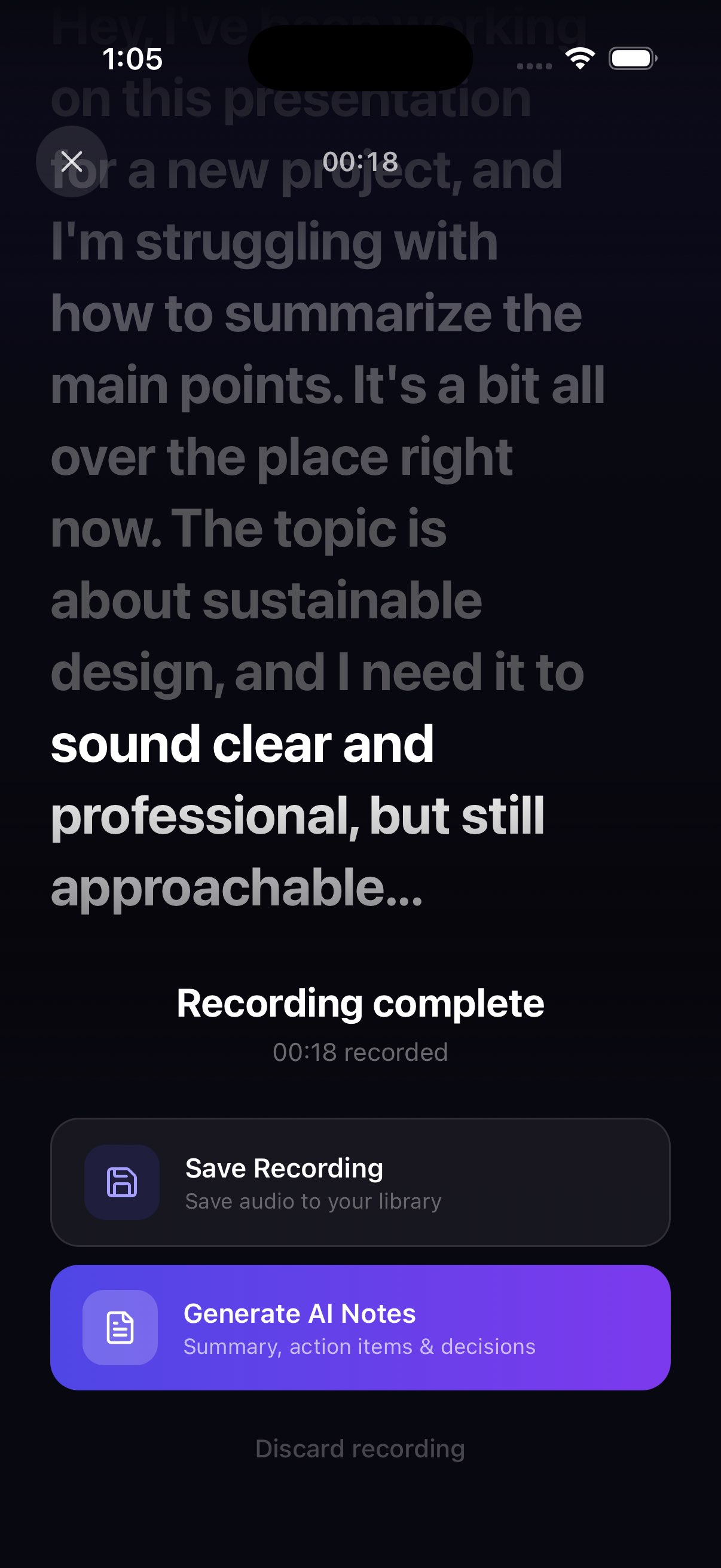 Real-time transcript display during recording with speaker labels and smooth text animations.