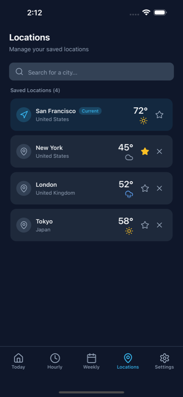 Search and save multiple locations, mark favorites, and quickly switch between cities.