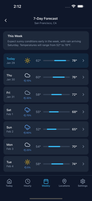 Weekly forecast with visual temperature bars, daily summaries, and precipitation indicators.